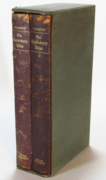 Pleasant Quarter leather Folio Society edition of Chacuer's canterbury Tales, done into contemporary verse by Coghill. The first printing. Illustrated by Woodcuts by Edna White. Decorated end-papers. Complete with slipcase. Mild shelf-wear to slipcase. Ru [more...]