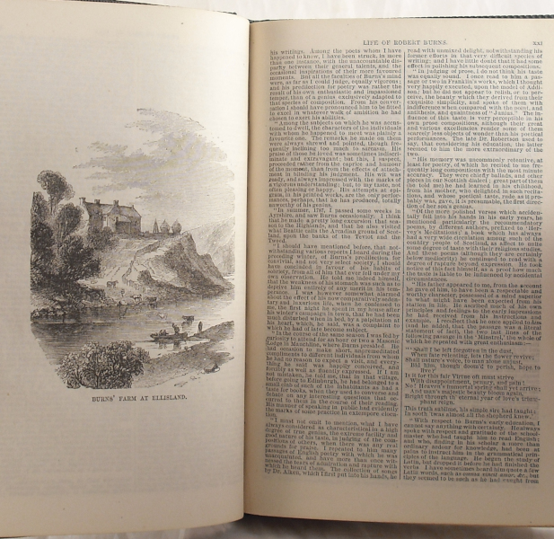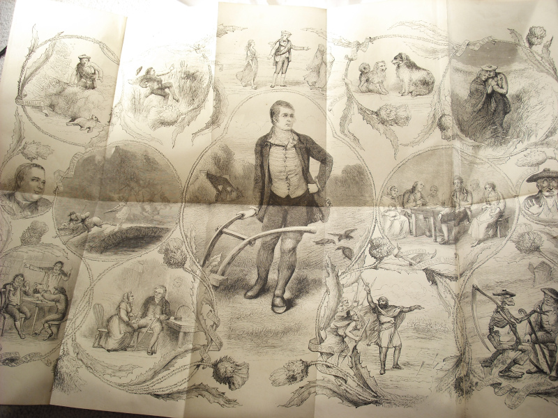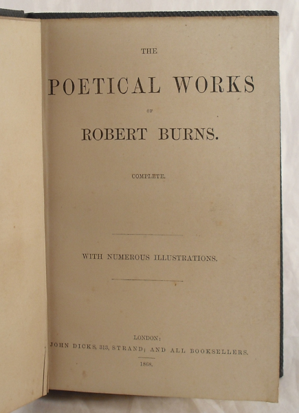 Rare edition of Burns' poetry with a brief biography of the author and his letters to rear. Verse printed in double columns. Neatly rebound in a pattern green cloth. With A terrific large fold-out frontispiece and b/w illustrations. A small tear to foldout-without loss. Mild offsetting to ffep. Contents clean and binding tight. Very good.