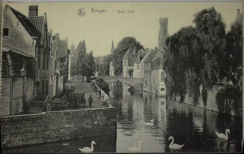 Souvenir booklet of 9 thick card b/w postcards featuring the sights of Bruges. No date but early 20th century. Appears complete. Paper covers are torn and worn at edges with front detached. Very light tanning to cards. fair.
