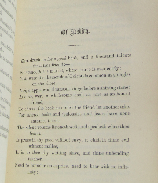 Poetical, philosophical aphorisms on a variety of topics including cheerfulness, beauty, ambition, etc. Full leather, bound by Riviere. All edges gilt. Raised bands to spine. Frontisportrait. Toning and rubbing to spine. Previous owner's inscription to front pastedown. Some spotting to title page and end-papers. Occasional pencil dashes next to interesting quotes. Contents otherwise clean and binding tight. Good.