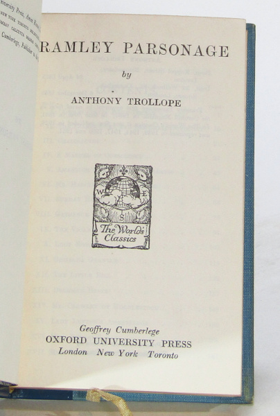 Handsome world's classics edition of Trollope's novel from his Chronicles of Barsetshire series. In publisher's blue quarter leather binding. Blue cloth to boards, top edge gilt. 12mo. Mild shelf-wear and rubbing to edges. Light tanning within, else contents clean and tight. Good+