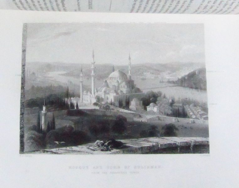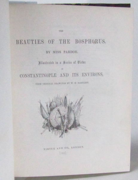 Nicely bound example of Pardoe's 1838 account of Constantinople and its surrounding areas. Complete with 87 engraved plates done from drawings by W. H. Bartlett, plus a frontisportrait of the author and a tissue guarded engraved title page. This superbly illustrated volume spun off from Pardoe's well received 1837 travelogue 'The City of the Sultan and Domestic Manners of the Turks', that provided one of the first unvarnished yet sympathetic portrayals of the Ottoman elite and their culture. Recently rebound in half leather with raised bands to spine and marbled end-papers. 4to. (280x220mm) [xii] 172pp. Some mild rubbing to leather. Some very light, occasional foxing within. Professional repair to a small tear to one plate. Faint stamp to reverse of fly leaf. Else a clean and tight example. Very good.