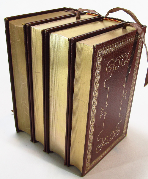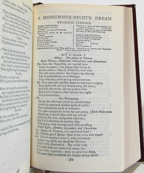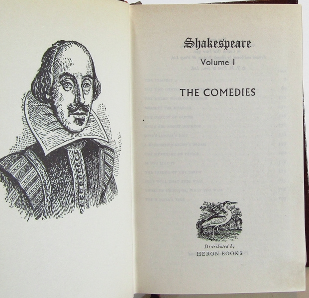 The rare deluxe Heron full leather edition of Shakespeare's Complete Works. Containing all his plays; his longer poems, The Rape of Lucrece and Venus and Adonis; and all of his sonnets. These compact volumes are in full leather and blocked with 23ct gold. With Silk-moire end-papers and book-marker ribbon. All edges gilt. Rubbing to edges, mainly tops and tails of spines and corners. Contents clean and bindings tight. Good+