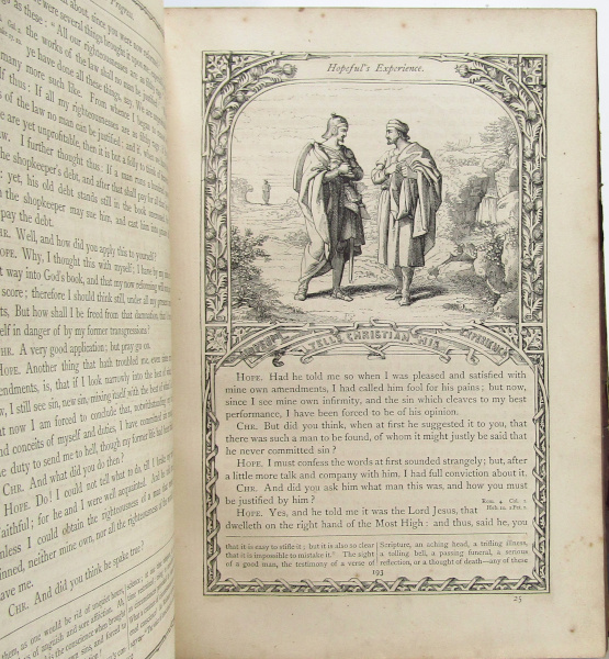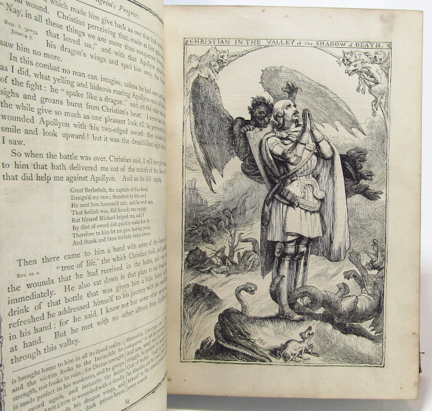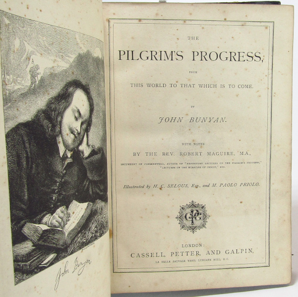 No date but c. 1870. Handsome half leather binding of Cassell's illustrated edition of Bunyan's allegorical story. With numerous excellent b/w engravings by H. C. Selous and M. Paolo Priolo. With decorated initials and ornate borders. Marbled baords. 4to. Loss to title label on spine. rubbing to top and tail of spine. Toning and Foxing throughout. Binding square and tight. Good overall.