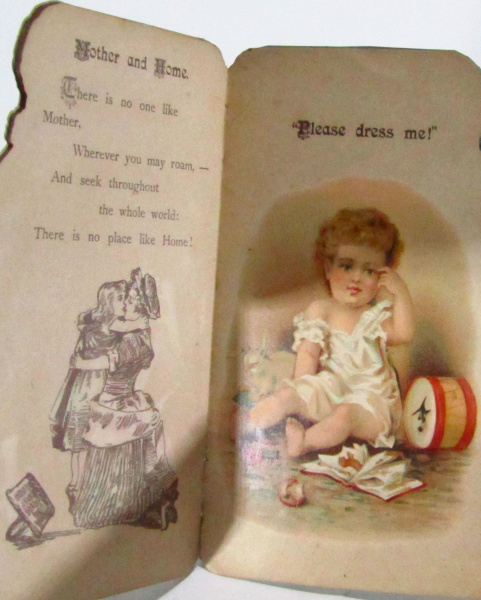 Interesting doll shaped pamphlet of children's verse with sepia toned and chromolithographic illustrations. Rear cover probably replaced. Small tear with neat tape repair to rear. Toning within but binding sound. Good overall.