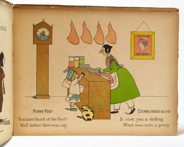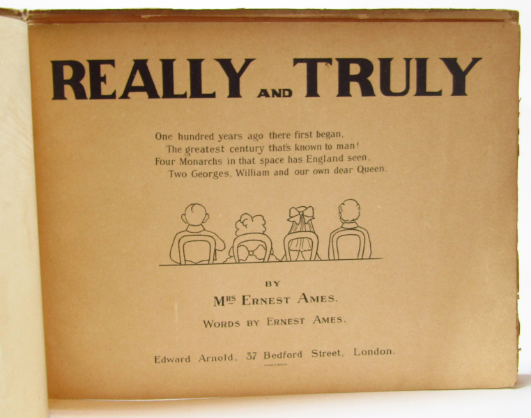 Nicely illustrated history of Britain over the nineteenth century, with key events and dates, each with colour illustrations by Mrs. Ernest Ames. Oblong 4to. Cracking to hinges, text-block coming loose. Heavy tanning to page edges, small tears and creasing to page edges. Fair.