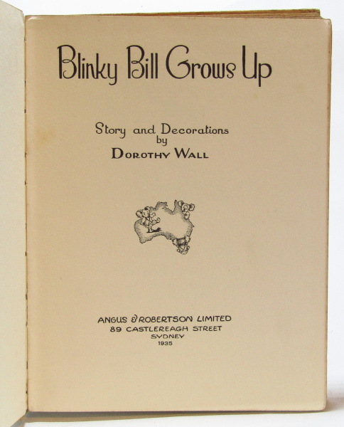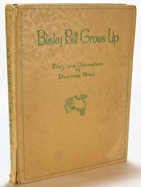 First reprint, in the same format as the 1934 first edition. Wall's second Blinky Bill story, with b/w illustrations throughout. 4to. Rubbing to edges with cracking to joints. Bumping to edges. Light foxing to page edges. Contents clean and sound. Good.