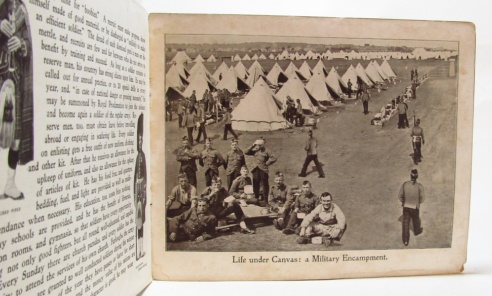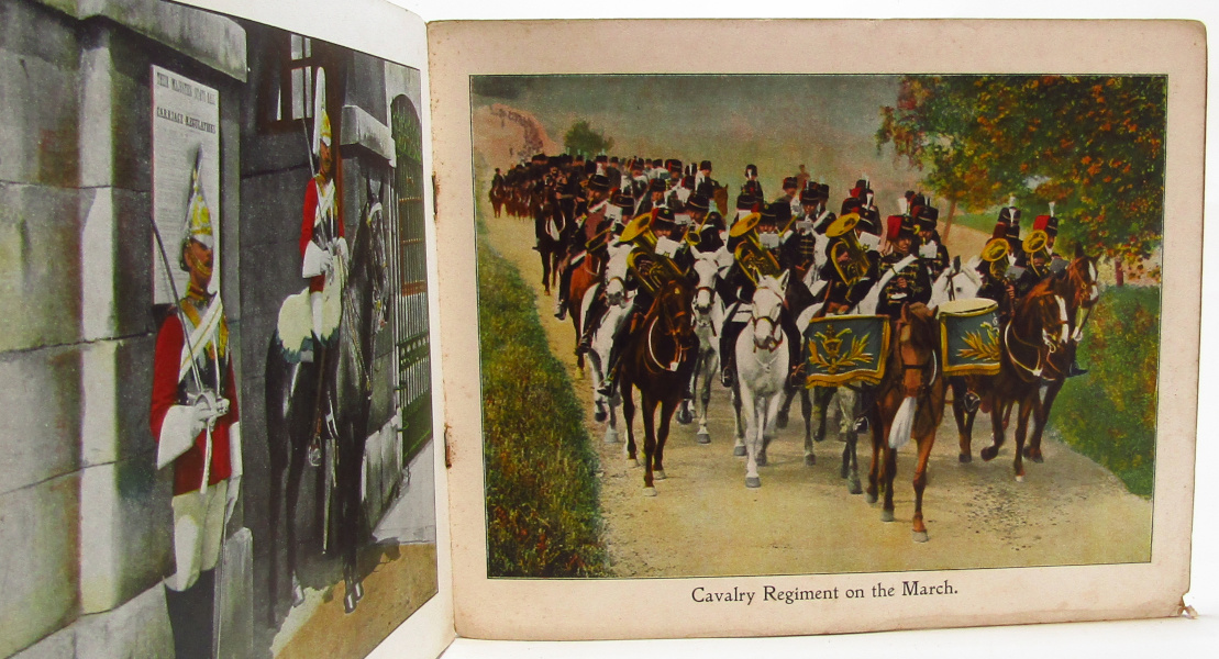 No date but c. 1905. Brief account of the soldiers of the British empire in the early 20th century. Featuring colourised photographs as well as illustrations and b/w photos. oblong 4to. Rubbing to edges and splitting to spine. Previous owner's name to cover. Toning and light spotting within. Fair.