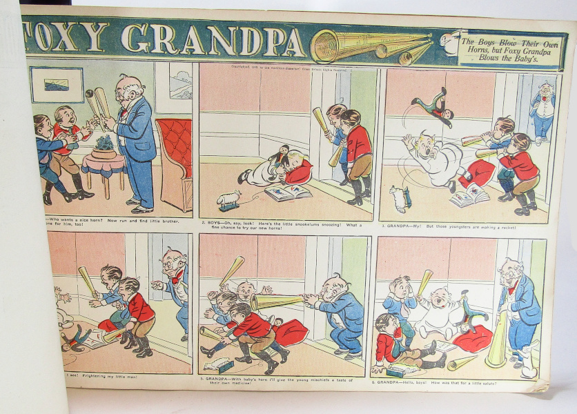Collection of comic strips in Schultze's popular Foxy Grandpa series, that first appeared in 1900 and lasted until 1918. Oblong 4to. Tears with loss to front and rear fore-edges of covers. Small tears to edges of last leaves, not affecting text or images, pages edges somewhat creased and tanned, otherwise text-block sound. Poor/fair.