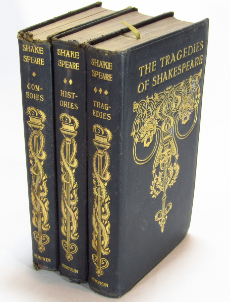 No date but c. 1930. Pleasant full leather edition of Shakespeare's Complete dramatic Works, divided into Comedies, Tragedies and Histories. Each with an original, quite excellent engraved frontispiece. Publisher's soft leather binding with gilt decoration. Top edges gilt. Decorated end-papers. 12mo. Rubbing to edges, esp. to tops of spine. Small tear to tail of spine of Histories volume. Mild toning within, else clean and sound. Good.