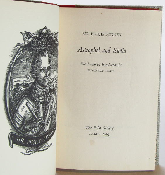 Quarter Leather Folio Society edition of Sidney's late 16th century collection of interconnected sonnets and poems. With an introduction by Kingsley Hart. Decorated end-papers and matching decoration throughout. Complete with slipcase. Slipcase has some wear and toning. Wear, tearing and loss to top of spine. Black ink marks to cover. Toning within, else clean and binding tight. Good overall.