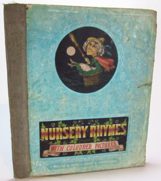 No date but c. 1900. Nursery rhymes told in verse, with terrific colour illustrations. Embossed card covers. Previous owner's repair to spine, tears to cover and repaired tears within. Tanning. Fair overall. [more...]