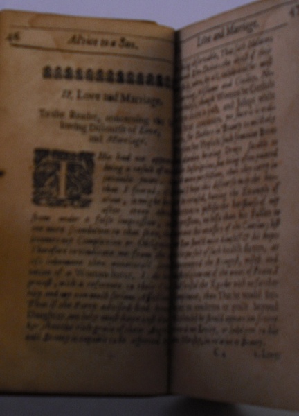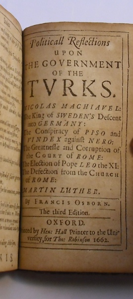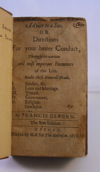 Two books bound as one. Advice to a Son (sixth edition) (1658) and Political Reflections upon the Government of the Turks and Discourses on Machiavelli, The King of Sweden, Martin Luther et al. (1662). Both published by Thomas Robinson. A courtier during the English Restoration, Osborn found fame for his book of advice for his son. A somewhat controversial text for its misogynist tone, it was parodied in his life time, questioned by Swift and Johnson and even denounced for atheistic undertones. Stout 18mo. Full calf. decorated initials. Marks and scratches. Slight loss to top of spine. Bookplate, owner's inscription. Tanning. Occasional small tears but no loss. Binding is firm and contents clean overall. Good.