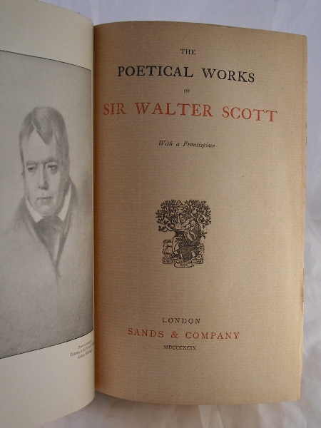 Pleasantly chunky edition of Scott's poetry. Printed on nice textured paper. Gilt and blind-stamped decorated covers. Spine sunned and staining marks to front and rear covers. Some foxing to endpapers. Tanning to page edge. But binding sound and contents clean. Good condition.