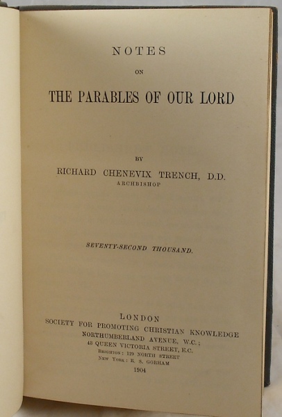 Pleasant half leather rebinding of Archbishop Trench's thoughtful, scholarly explanations of parable. A poet in the circle of Wordsworth, Trench entered the Church but continued his literary endeavours. Raised bands, all edges gilt. Marbled endpapers. Prize plate to front pastedown. London Diocesan board of education crest to cover. Leather is mildly rubbed but retains a handsome look. Contents are prim and clean, binding is tight. Good/very good.