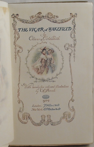 Charming cloth edition of Goldsmith's 1766 novel from Dent's English Idylls series, featuring elaborate gilt decoration and 25 colour plates by C. E. Brock. Light green cloth. Top edge gilt. Fore edge rough cut. Decorated end-papers. Previous owner's inscription to blank. Splitting to inner hinge but text binding still sound. Foxing to tissue guard of frontispiece. Otherwise contents clean and prim. Good.