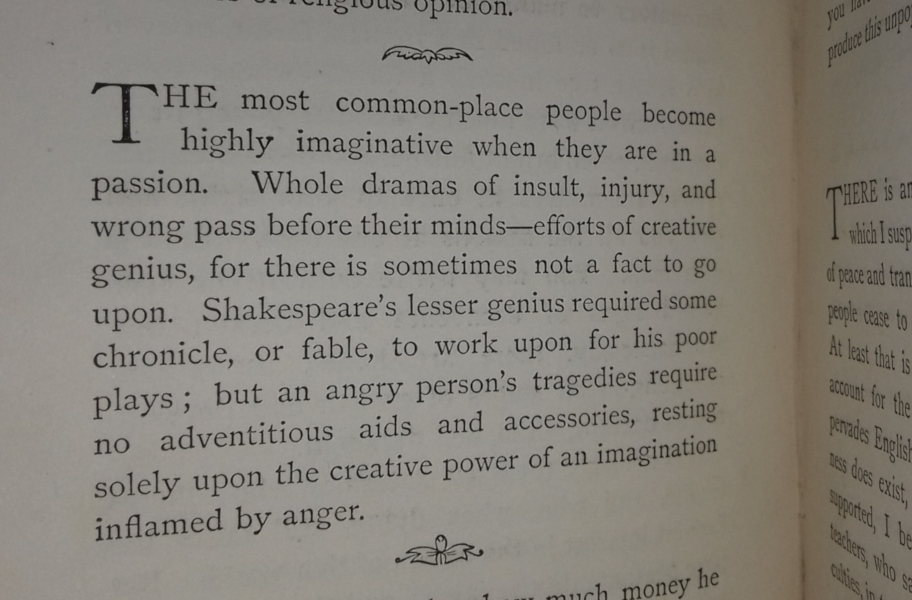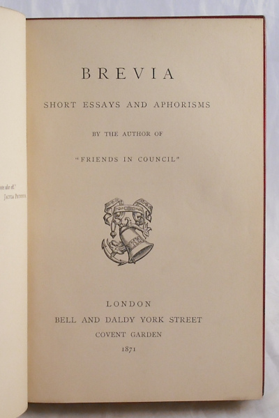 Charming volume of short writings and aphorisms by the author of Friends in Council. Subjects vary from perennial issue to specifics of the time, such as the French Claque and the need to rehabilitate the reputation of st. George. Fine leather binding. Full red leather with raised bands and gilt rolls. All edges gilt, outer dentelles. Elaborate crest to cover. 12mo. 208pp. Previous owner's inscription to front blank. Light foxing to free end-papers. Rubbing to extremities. Light marking, scratch to cover. But contents clean and prim. Binding tight. Good/very good.