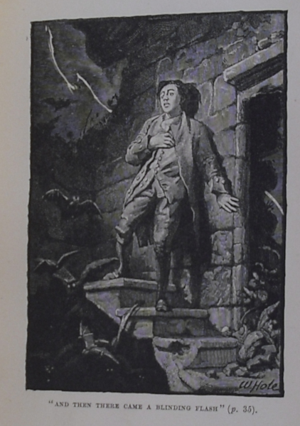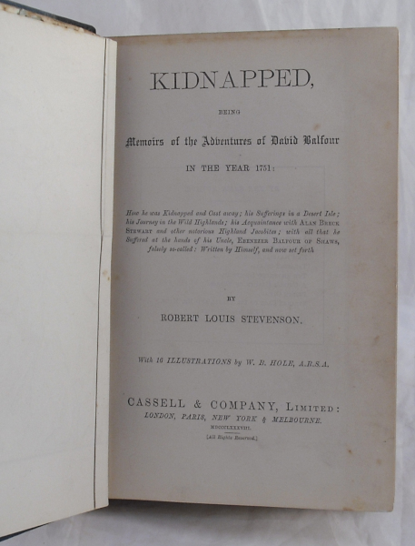 Pleasant early illustrated of Stevenson's historical adventure. With 16 excellent b/w illustrations by W. B. Hole and fold out map. Bound in half leather marbled boards. Top edge gilt. 12mo. [vi] 311pp. With advert of Treasure Island to rear. Previous owner's bookplate to front pastedown. Map has small portion missing of insert, main map unaffected. Rubbing to leather with nicks to spine. Foxing to endpapers but contents otherwise clean and binding tight. Good.