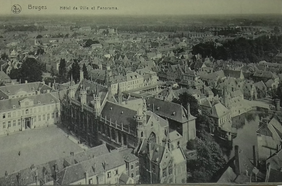 Souvenir booklet of 9 thick card b/w postcards featuring the sights of Bruges. No date but early 20th century. Appears complete. Paper covers are torn and worn at edges with front detached. Very light tanning to cards. fair.