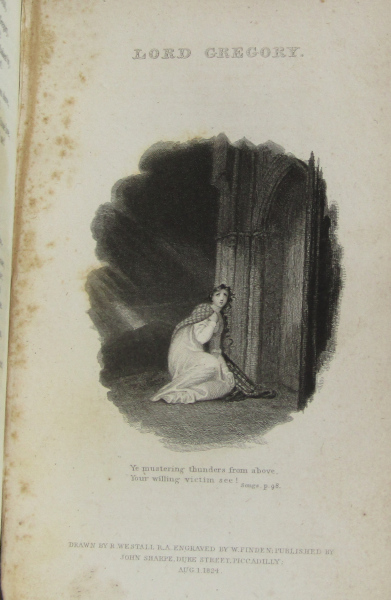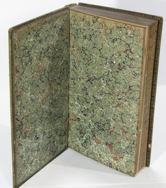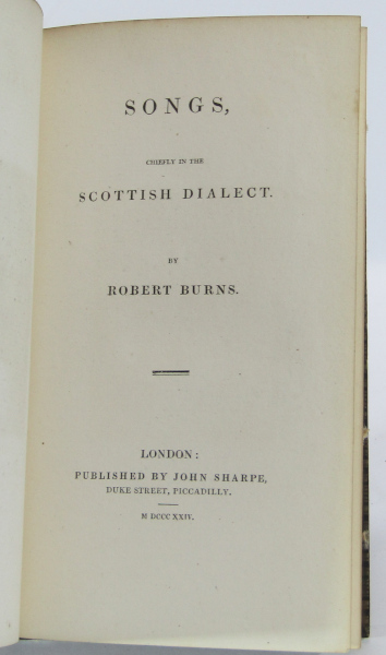 Pleasant leather binding of Burns' songs, his posthumous poems and further reliques, With engravings. Full leather with gilt lyre decoration to spine. Marbled end-papers with matching marbling to page edges, with inner and outer dentelles. Toning and rubbing to covers, especially to top of spine where there is slight loss. Some mild spotting to edges of plates, otherwise bright and clean within. Binding tight. Good.