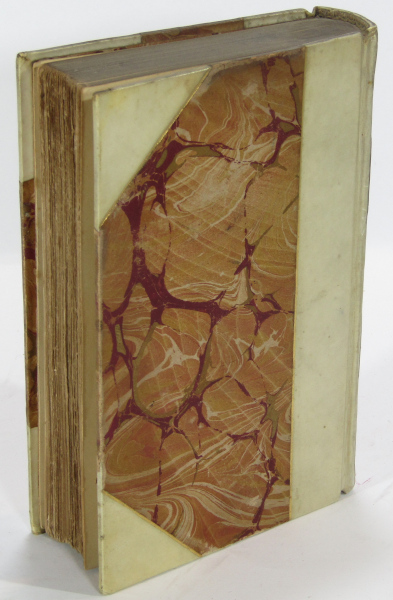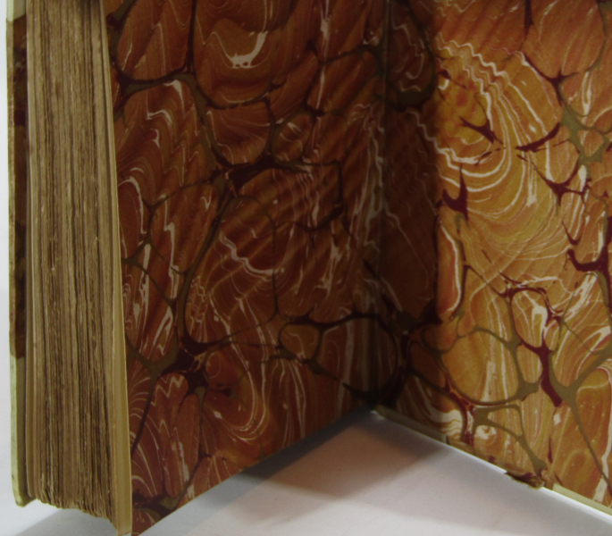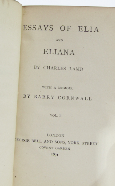 Volume I of the essays of Charles Lamb, this volume containing the complete Essays of Elia, Rather nice half vellum binding with metallic marbled paper boards with matching marbled end-papers. Elaborate gilt decoration to spine. Top edge gilt. small 12mo. Toning and soiling to spine. Light foxing to fore-edge. Contents clean and tight. Good