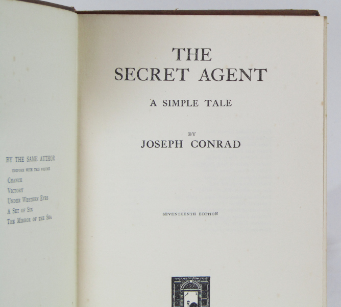 Curious special edition of Conrad's 1907 political novel, a response to the growing threat of anarchism and terrorism. 17th edition. Publisher's elaborate special decorative leather binding with onlays and gilt cross. Top edge gilt. Fore edge rough cut. 12mo. Some light foxing to fore-edge. Rubbing to top and tail of spine and edges. Contents clean and binding sound. Good+
