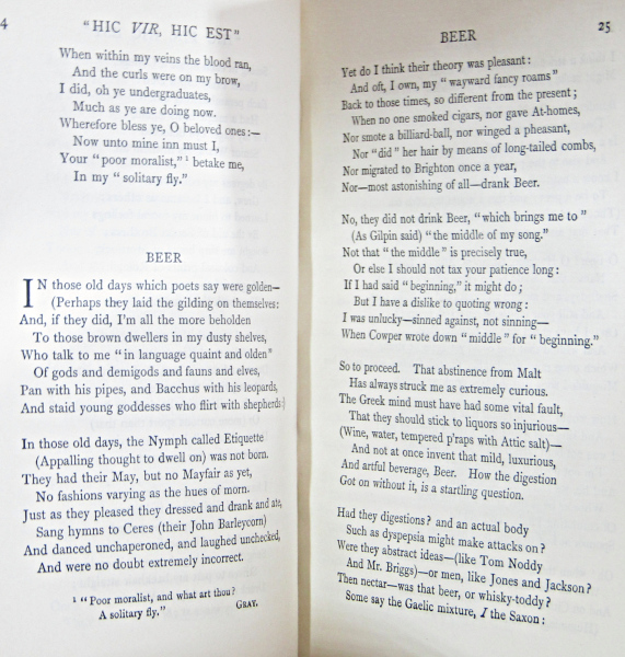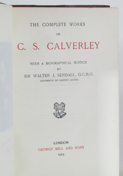 The collected works of Calverley with a biographical notice by Walter Joseph Sendall, his contemporary at Cambridge. Contains the popular poems Beer and an Ode to Tobacco. Splendid half leather binding done by Hatchards. With gilt decoration to spine. Top edge gilt. Marbled end-papers. 8vo. Some light sunning to spine and toning to covers. Very mild foxing to fore-edge. Rubbing to edges. Contents clean and tight. Very good.