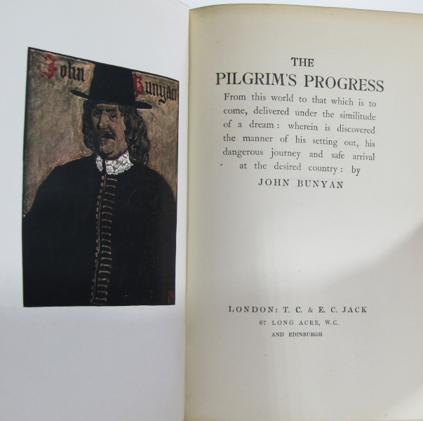 Handsome illustrated edition of Bunyan's allegorical christian tale. With 28 rather romantic colour plates done by Byam Shaw, plus a frontis-portrait of Bunyan. With the author's apology. No date but c. 1930. Red cloth with gilt decoration and titling. Top edge gilt, fore-edge rough cut. 8vo. Some mild foxing to fore-edge and front matter. Light rubbing and bumping to edges. Contents sound and binding tight. Very good.