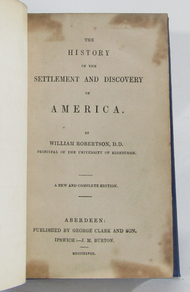 Neatly rebound compact one volume edition of Robertson's important 1777 History of America. Bound in blue cloth with printed marbled end-papers. Some toning to title page, tanning to page edges. Contents clean and tight. Very good.