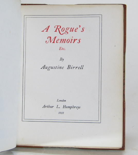 Handsome compact leather binding of three of Birell's fascinating extended essays. The first, examines various forms of biases in recording history. Half leather with marbled boards. Gilt -decoration to spine. Top edge gilt. Previous owner's name to ffep. Some mild rubbing to leather. Occasional light spotting within. Binding tight. Very good.