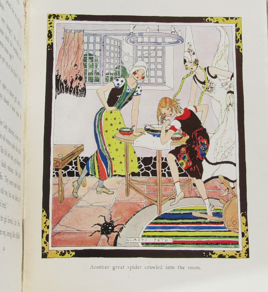 Collection of fairy-tales and nursery rhymes, retold though a framing device. Complete with 8 stylish colour plates by Gladys Peto. Fore-edge rough cut. no date but c. 1920. 4to. Splitting to front and rear joints. Sunning to spine. Rubbing and bumping to edges. Lacks ffep. Some mild toning to edges, text-block otherwise clean and sound. Fair.