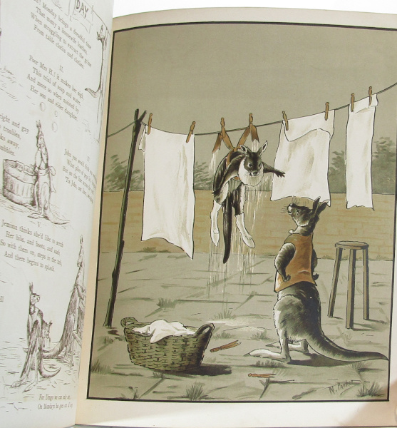 Illustrated collection of verse describing the adventures of a family of Kangeroos. With chromolithographic plates and b/w illustrations. to. No date but c. 1910. Rubbing to edges with backstrip missing. Cracking to hinges. Toning and light spotting within. Textblock sound. Fair.