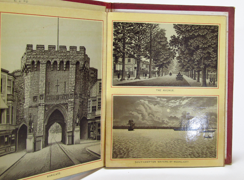 Album featuring 23 nicely done, glossy engraving of various scenes and sights around Southampton, including the Bargate, Netley Hospital, the waters by moonlight and more. Bound in a concertina style. Decorative cloth covers. No date but c. 1880. Heavy rubbing to spine. Mild toning within, some joints split but all images intact and clean. Fair+