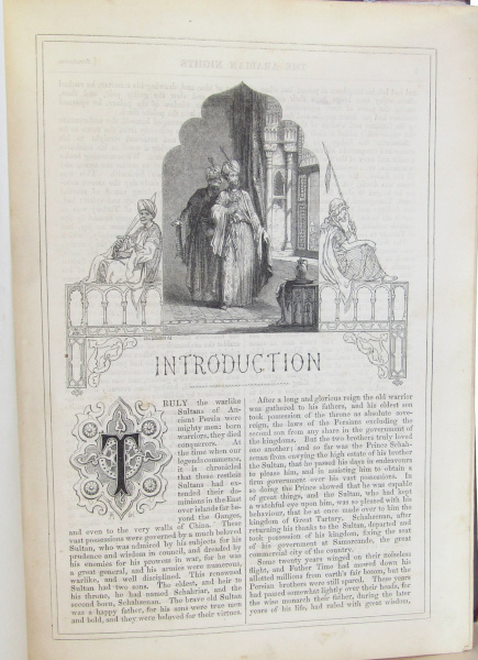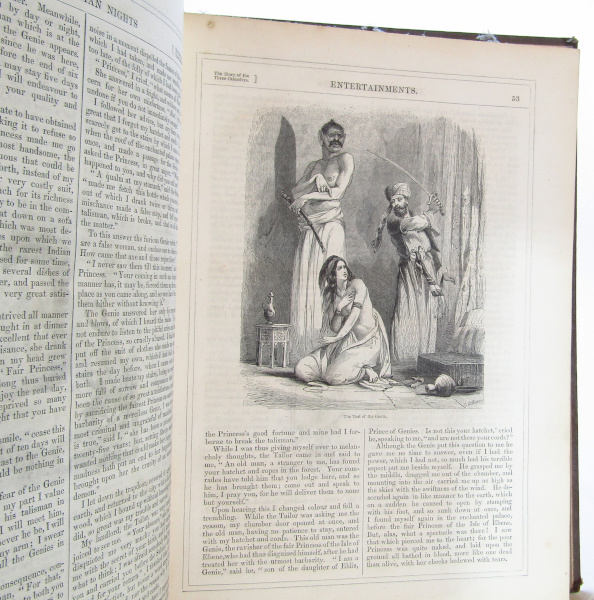 Obscure edition of the Arabian Nights, published 'weekly or monthly in five parts.' Contains the introduction and numerous well known tales including the Fisherman and the Genie, Sinbad etc. With engravings throughout. 4to. 336pp. No date but c. 1870. No title page and ends abruptly, so incomplete. Using an unidentified translation. Covers have general wear and some label residue to cover. Contents clean and tight. Good.