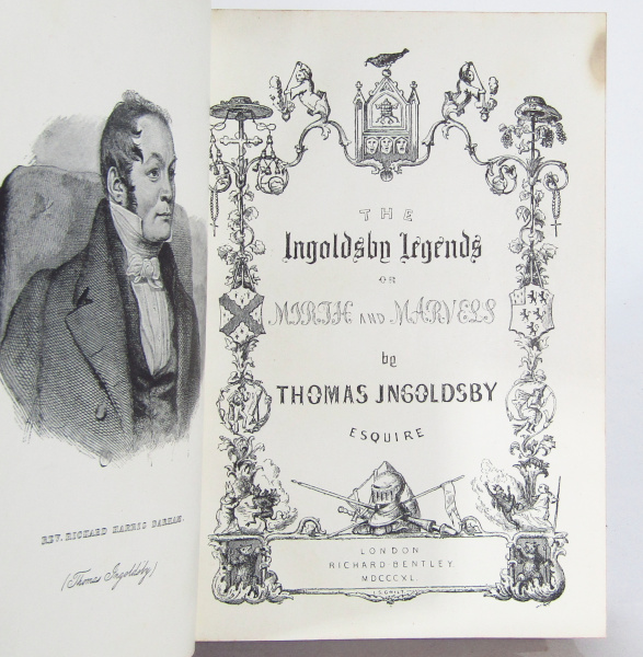 Pleasant half leather binding of the popular Ingoldsby Legends, a collection of often humorous tales involving ghosts, witches, historical figures & mysteries that draw on, a frequently send up, existing legends. With reproductions of the original illustrations by Cruikshank, Tenniel, Leech et al. Plus a facsimile of the original Bentley title page. Red half leather with marbled paper to boards, with matching marbling to end-papers and page edges. 8vo. Rubbing to edges. Slight offsetting from leather top corner. Contents clean and binding sound. Good+