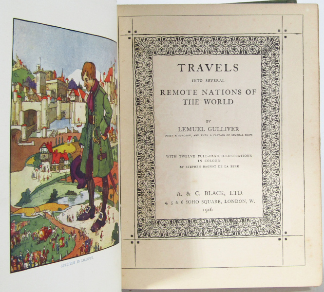 Handsome, decorative, illustrated edition of Swift's enduring satire. With with colour plates by Stephen Baghot de la Bere. Previous owner's name to ffep. Light rubbing to edges Foxing to front matter and Faint spotting and tanning within. Binding sound. Good.