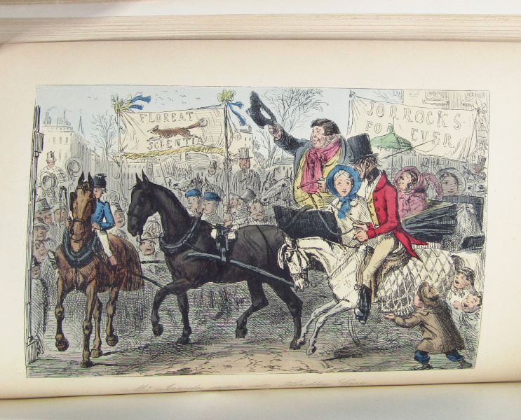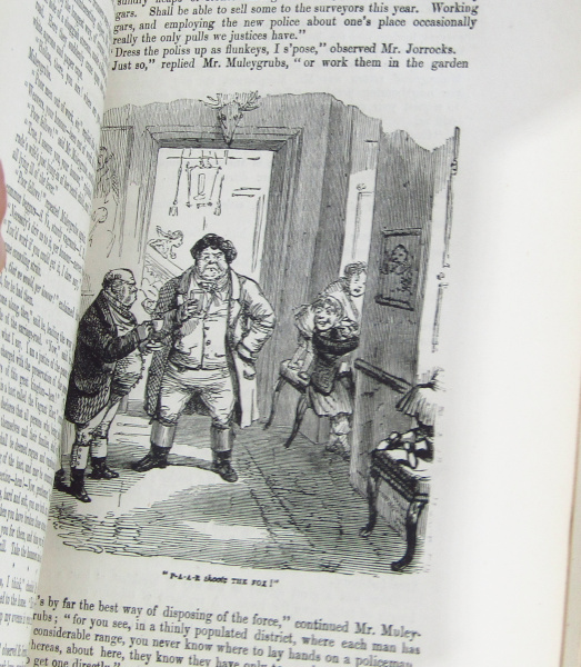 No date but c.1890. Nicely rebound edition of Surtees' popular humorous hunting themed novel. Featuring hand coloured steel engraved plates by John Leech plus hand-coloured title pages and dozens of b/w wood engravings within the text. 8vo. Rebacked with a new leather spine, with original decorative cloth to boards. Raised bands and gilt decoration to spine. Beveled edges. 8vo. Light marking to covers. Previous owner's name and inscription to end-papers. Mild tanning within, else clean and tight. Very good.