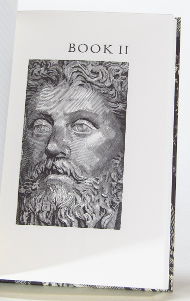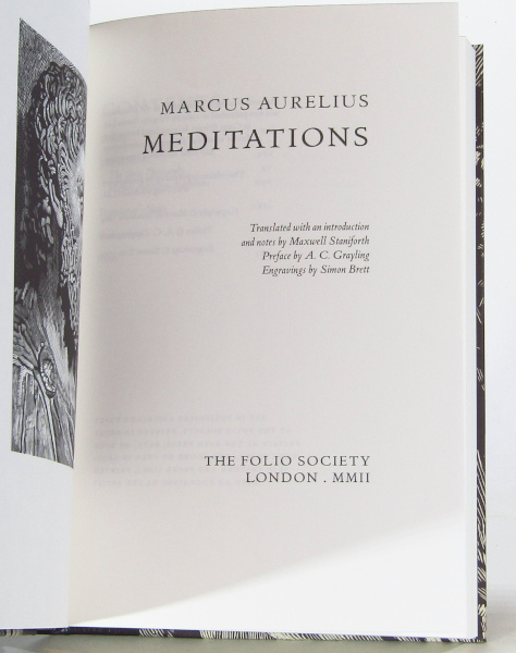 Splendid Folio Society edition of Marcus Aurelius' Meditations. With a preface by A. C. Grayling explaining the Emperor's stoic philosophy, which he recorded in these private notes. B/w illustrations by Simon Brett. Quarter leather with pictorial paper to boards. Complete with slipcase. In crisp, fine condition.