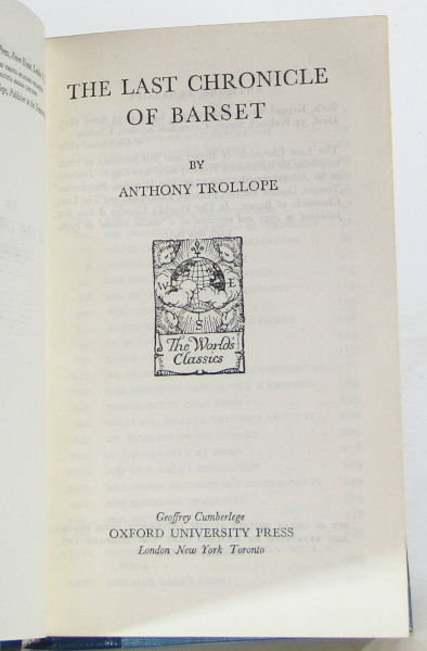 Handsome world's classics edition of Trollope's novel from his Chronicles of Barsetshire series. In publisher's blue quarter leather binding. Blue cloth to boards, top edge gilt. 12mo. Mild shelf-wear and rubbing to edges. Light tanning within, else contents clean and tight. Good+