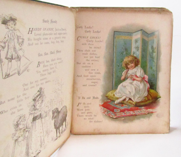 No date but c. 1890. Charming collection of popular nursery rhymes with b/w and chromolithographic plates. 4to. Spine is torn with loss, binding loosening. Frontispiece and half-title apparently bound in later, tape repairs, small tears to edges. Foxing within. Lacks free end-papers. Poor but usable.