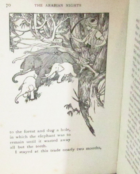 No date but c. 1920. Illustrated edition of these three Tales from the (expanded) Arabian Nights, seemingly adapted from Gilbert's translation. With colour illustrations and b/w drawings within the text Light marking and toning to decorative covers. Tanning to page edges, mild spotting within. Some plates loosening and rear free end-paper detached. Else sound and clean within. Good overall.