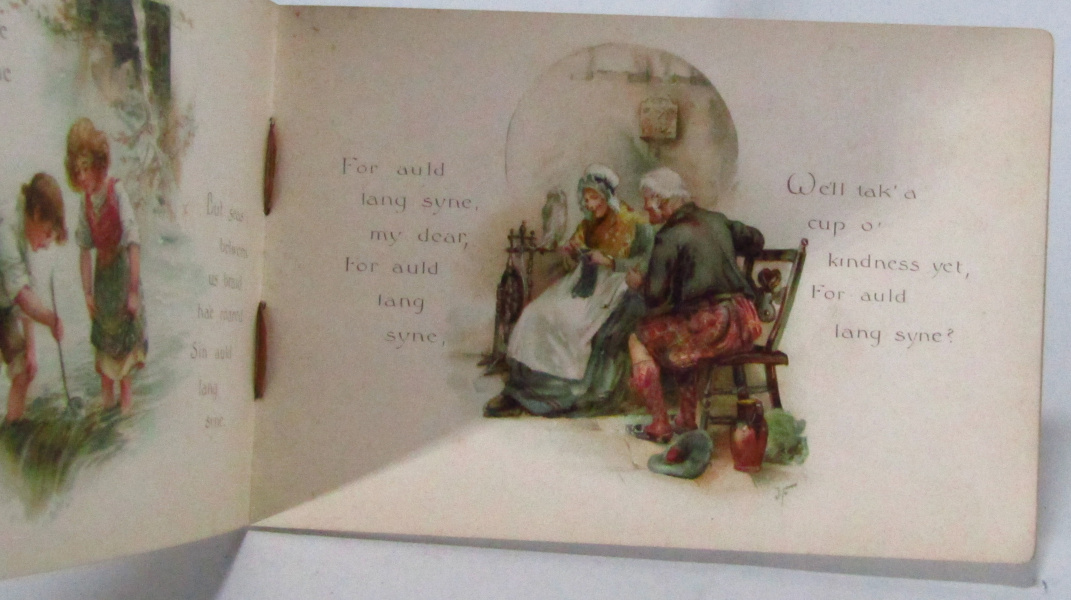 No date but c. 1890. Nicely produced edition of Burns' enduring poem, with chromolithographic illustrated and decorated initials. oblong 12mo. Bound with cord with bow. Toning to covers and within, else clean and tight. Good+
