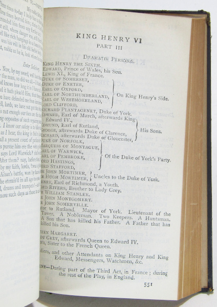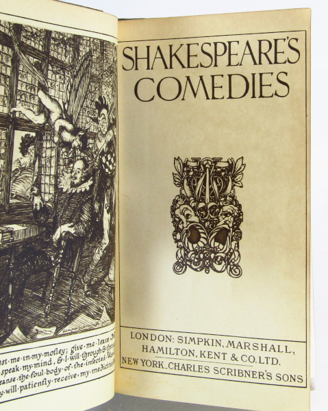 No date but c. 1930. Pleasant full leather edition of Shakespeare's Complete dramatic Works, divided into Comedies, Tragedies and Histories. Each with an original, quite excellent engraved frontispiece. Publisher's soft leather binding with gilt decoration. Top edges gilt. Decorated end-papers. 12mo. Rubbing to edges, esp. to tops of spine. Small tear to tail of spine of Histories volume. Mild toning within, else clean and sound. Good.