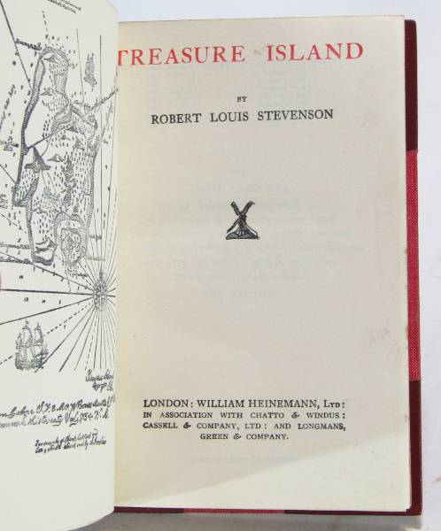 Handsomely rebound Tusitala edition of Stevenson's enduring adventure. Half leather with raised bands and gilt decoration to spine. Marbled end-papers. Top edge gilt. With a map as frontispiece. 12mo. Previous owner's inscription to fly-leaf. Mild foxing to fore-edge, else clean and tight. A nice little copy. Very good.