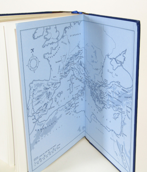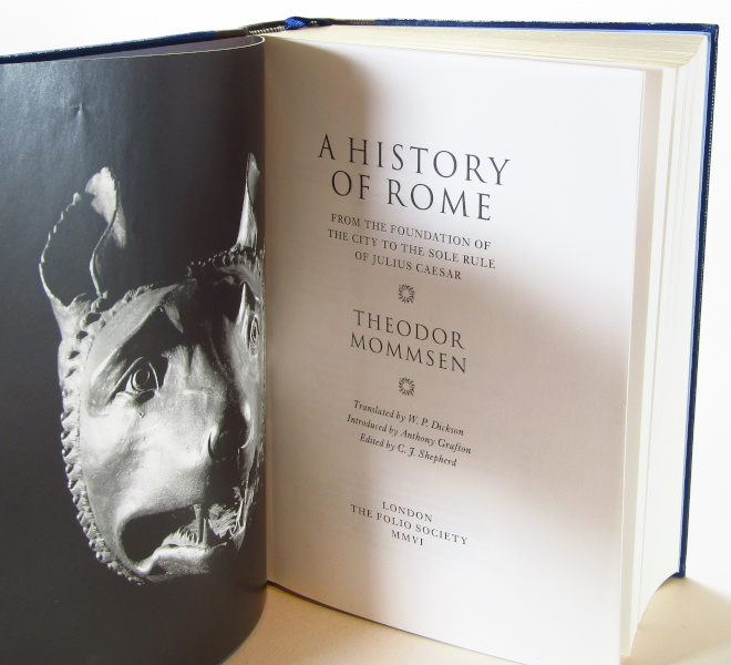 'From the foundation of the City to the sole rule of Julius Caesar'. Splendid special quarter leather Folio Society edition of Mommsen's classic work of Roman History published in three volumes from 1854-1856. Mommsen considered Caesar the paragon of enlightened leadership and sought to apply the lessons of Roman politics to his own time. Such was his admiration of Caesar, it is said Mommsen left the book unfinished so as to not describe his murder. A subsequent volume which would have dealt with the Roman Emperors was not published due to its criticisms of contemporary German politics. With b/w maps and images. Maps to endpapers. Top edge gilt. Cloth boards with gilt design by Simon Brett. Complete with slipcase. Slipcase has some light shelfwear. Slightest rubbing to edges. Near Fine.