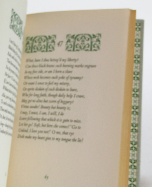 Quarter Leather Folio Society edition of Sidney's late 16th century collection of interconnected sonnets and poems. With an introduction by Kingsley Hart. Decorated end-papers and matching decoration throughout. Complete with slipcase. Slipcase has some wear and toning. Wear, tearing and loss to top of spine. Black ink marks to cover. Toning within, else clean and binding tight. Good overall.