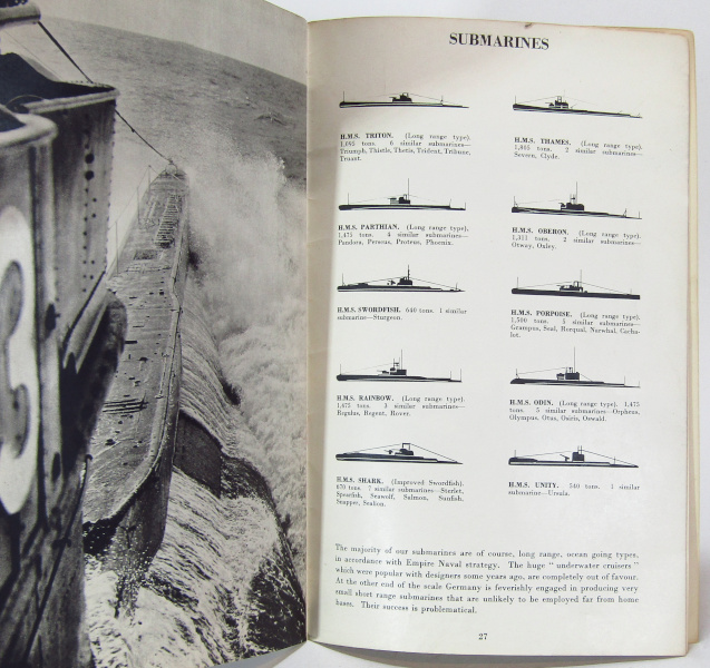 No date but c. 1940. A guide to the various ships and submarines with b/w images and diagrams. Rubbing and toning to covers. Tanning to page edges. Contents sound, Good.