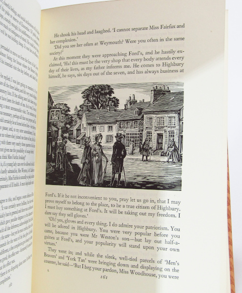 Early Folio Society edition of Jane Austen's Emma. With wood-engravings by Joan Hassall. Quarter cloth with decorated paper boards. Portrait of Austen to end-papers. Complete with slipcase. Spine is faded as is common with this edition, with some bumping to edges. Slipcase has mild wear. Contents are clean and tight. Good condition.