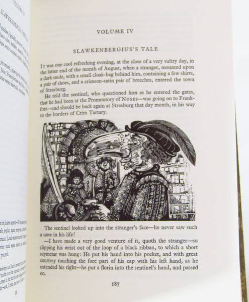 Pleasant Folio Society edition of Sterne's pioneering comic novel, first appearing in 1759. Decorative cloth with leather label to spine. Illustrated with wood-engravings by John Lawrence. Complete with slipcase. Rubbing to leather label, foxing to page edges. Wear and rubbing to slipcase, contents clean and sound. Good.