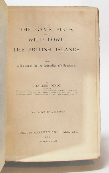 'Being a handbook for the naturalist and sportsman.' Practical guide to the various birds of Britain, detailing the habitats, distribution, habits, nidification etc. With b/w plates by A. T. Elwes. Inscribed by the author but without his signature. 8vo. Bound in half leather with marbled boards. Raised bands and decoration to spine. Fore-edge rough cut. Some light wear to edges. Tanning to page edges, else clean and tight. Good+